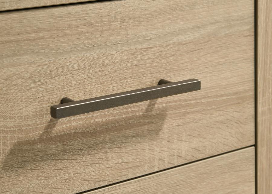 • Six-drawer dresser with modern lines and light oak finish for relaxed sophistication