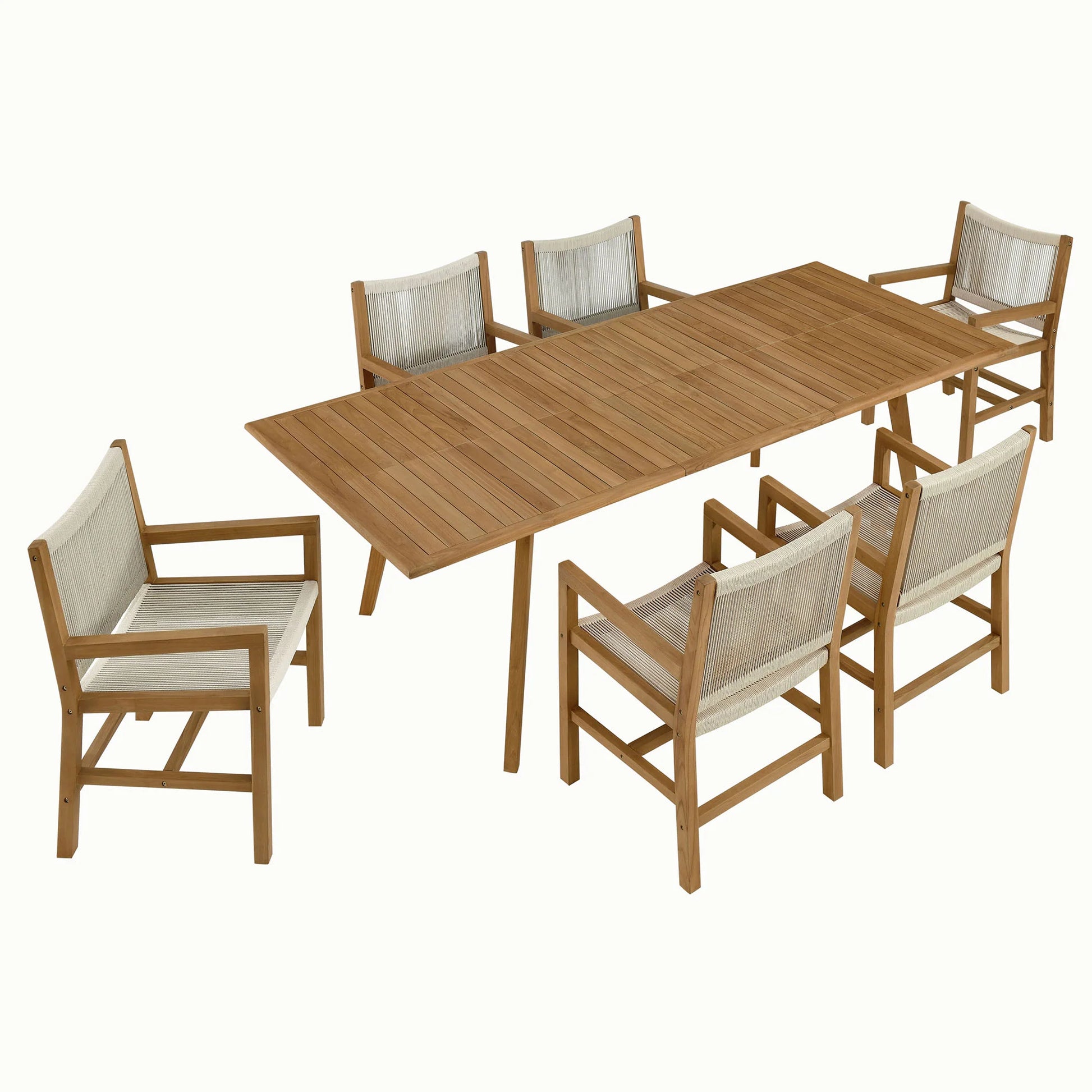 Refresh your outdoor dining experience with the 7-Piece Teak Rectangular Table Patio Furniture Set. This modern outside patio set includes the Vienna Extendable Teak Dining Table and 6 Vienna Outdoor Dining Armchairs, effortlessly accommodating larger gatherings along with everyday outside dining. The naturally weather-resistant teak outdoor dining table features a slatted surface and extends from 71" to 94.5", making it perfect for hosting more guests or adjusting to fit your outdoor patio needs. Add to that, its wood dining chairs with armrests and seats woven with high-quality nylon rope, and this patio dining furniture set for 6 creates a contemporary and cohesive look ideal for any patio or garden setting. Whether used on its own or mixed with other outdoor patio furniture, the Vienna 7 piece patio dining set blends effortlessly, complementing a diverse range of outdoor patios. Assembly Required.