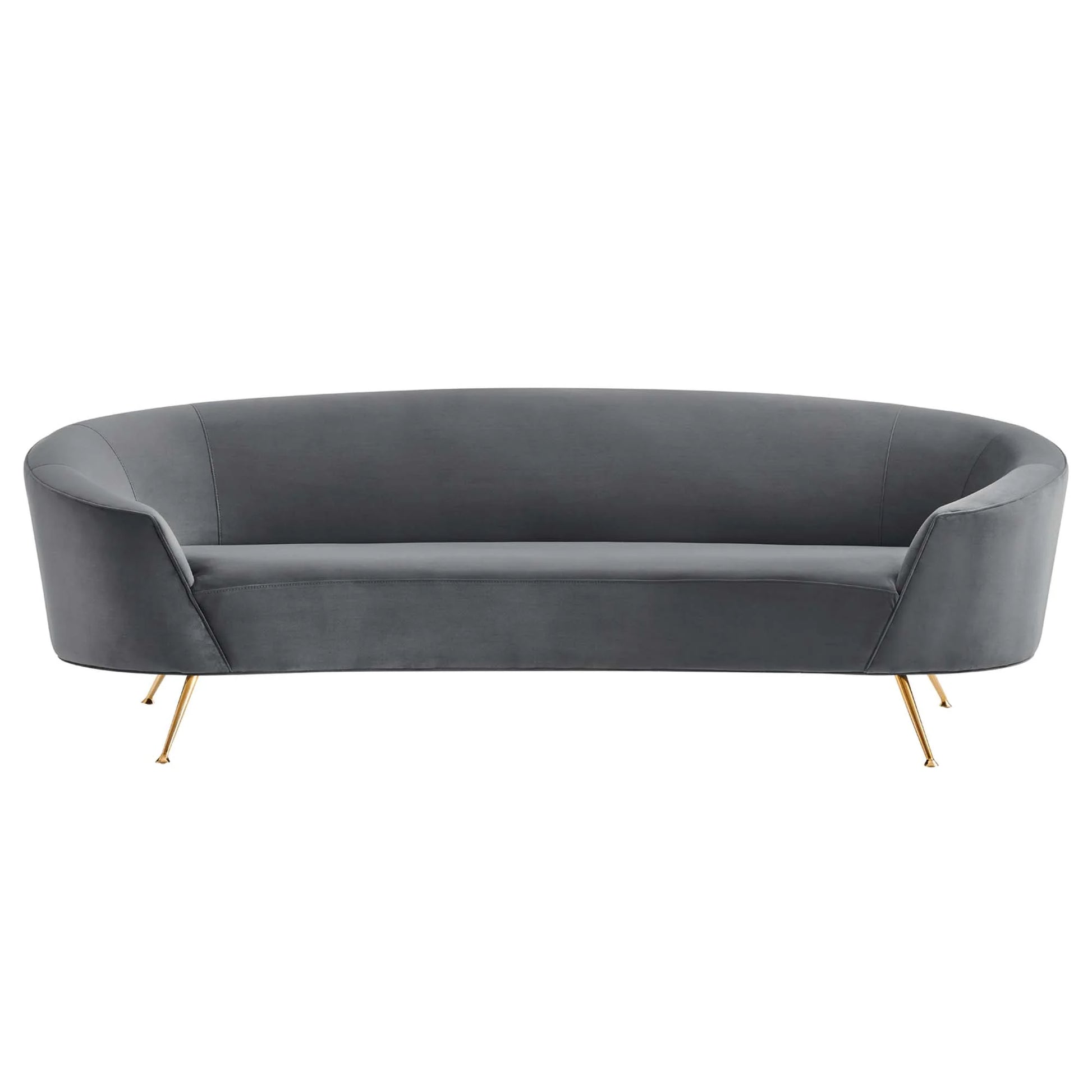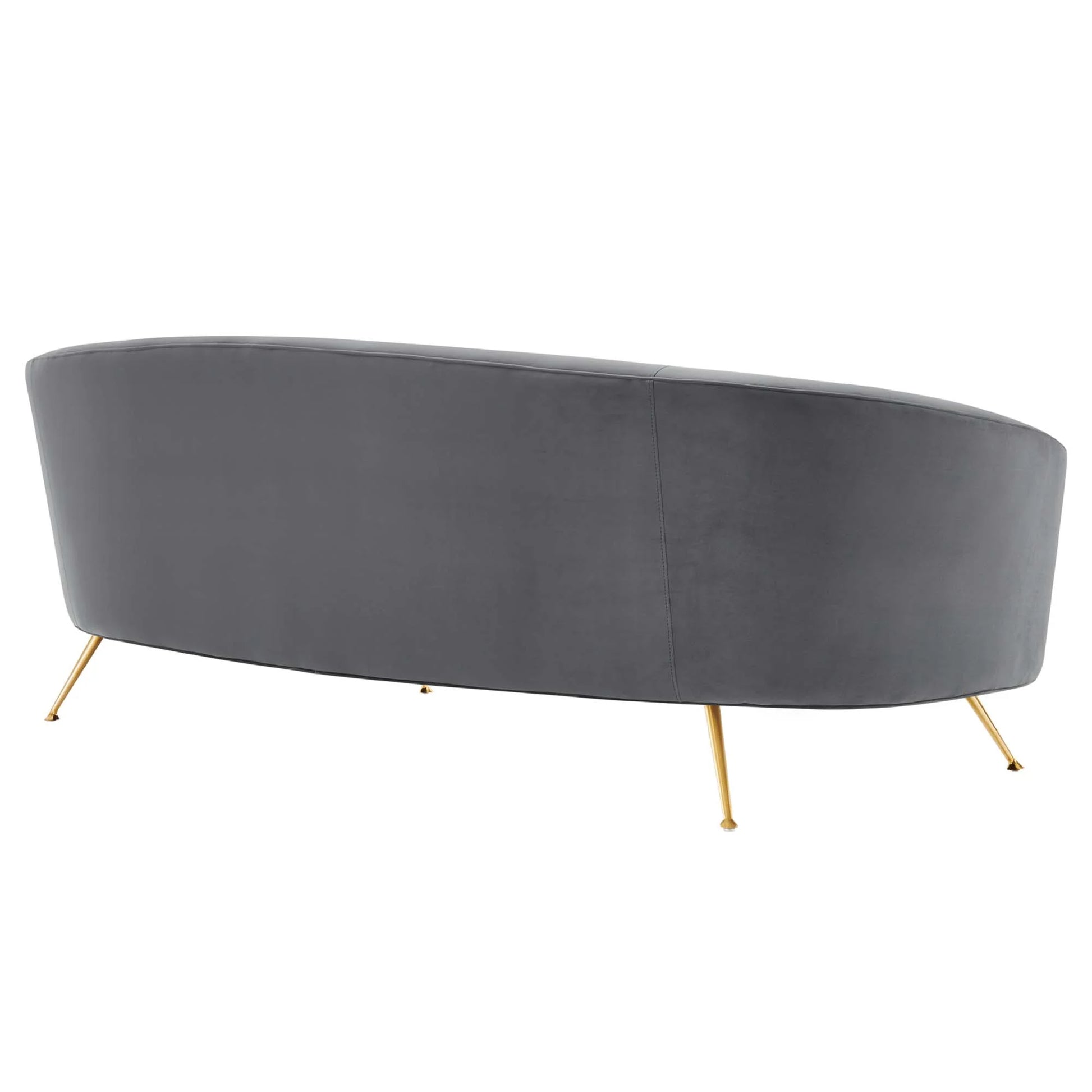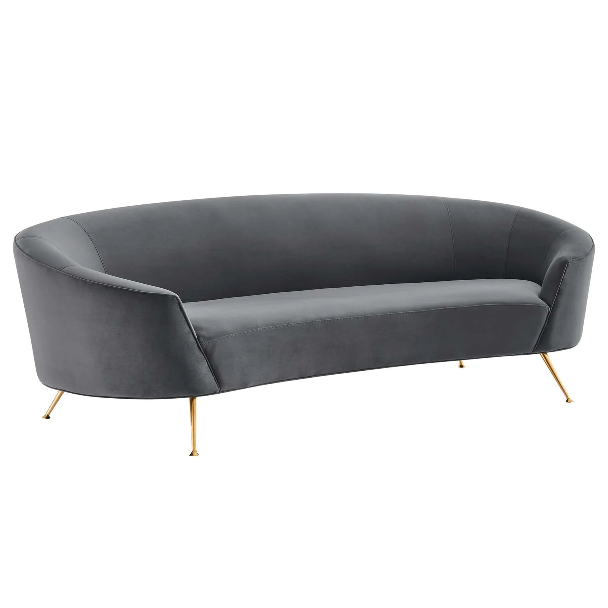 Elevate your living room style with the sophisticated aesthetic of the Marchesa Performance Velvet Sofa. Solidly constructed with a durable webbed support system, this retro-modern sofa enlivens your living room or lounge area. Carried with panache on splayed gold stainless steel legs, this expansively curved sofa is the picture of elegance in mid-century modern, contemporary or eclectic settings. The Marchesa Performance Velvet Sofa is sure to become a compelling family room favorite with dense foam padding and stain-resistant performance velvet upholstery. This sturdy couch is a gracious addition to the bedroom or home office. Marchesa is outfitted with non-marking foot glides to protect your floors. Sofa Weight Capacity: 993 lbs.