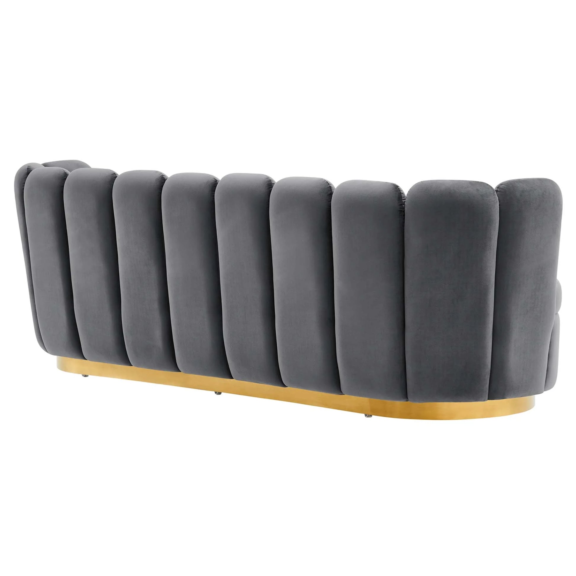 Defined by bold vertical channel tufting and a scalloped edge, the Victoria Performance Velvet Sofa resonates with retro glam appeal in mid-century modern or eclectic decors. Create an inspired setting in your living room, bedroom, or lounge area with this velvet sofa, featuring dense foam padding and a webbed support system for superior comfort. The Victoria Sofa conveys the essence of a modern heirloom piece, features an inset gold metal rim and artfully upholstered stain-resistant performance velvet. This sturdy couch comes equipped with non-marking foot glides to protect your floor. Sofa Weight Capacity: 993 lbs.