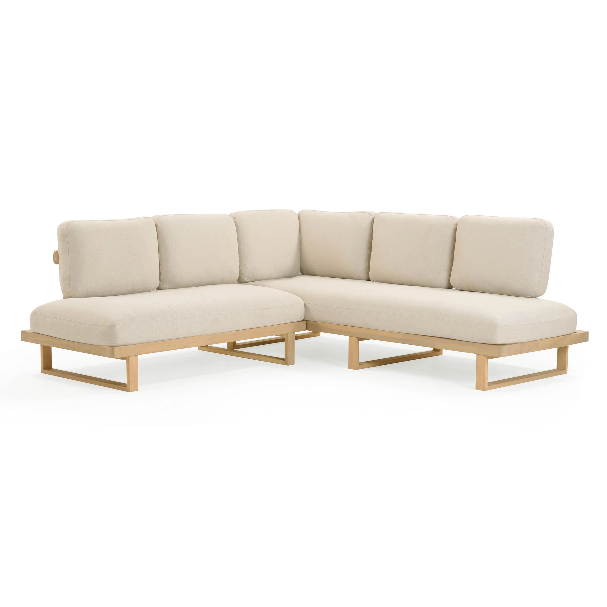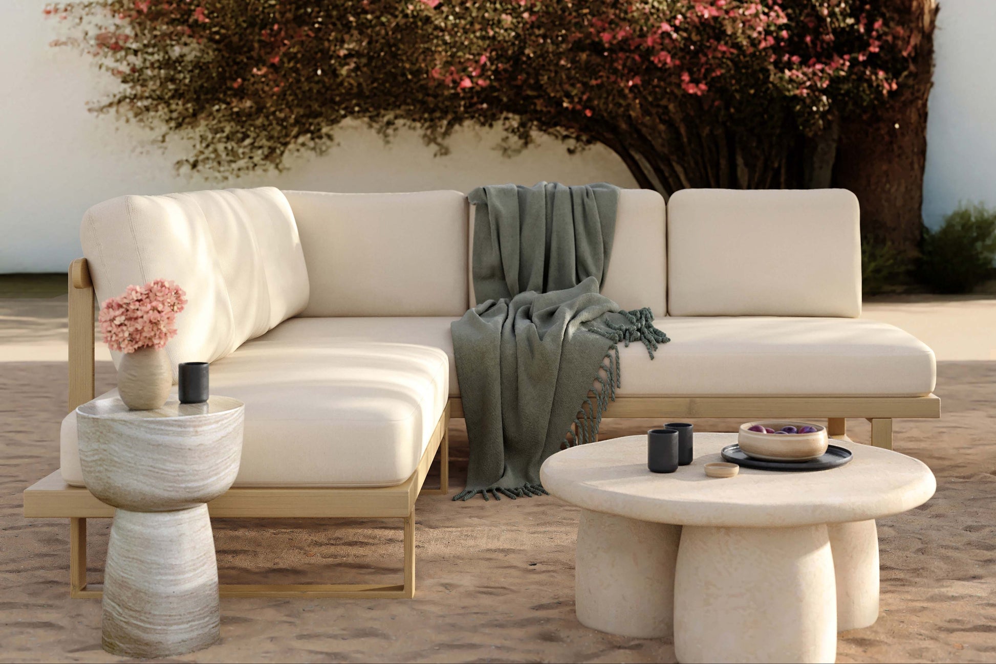 The Evan Sectional brings a fresh feel to your open-air lounge. Crafted from weather-resistant eucalyptus with a teak-inspired finish and plush outdoor-grade upholstery, its hidden velcro straps keep the configuration sleek and secure.