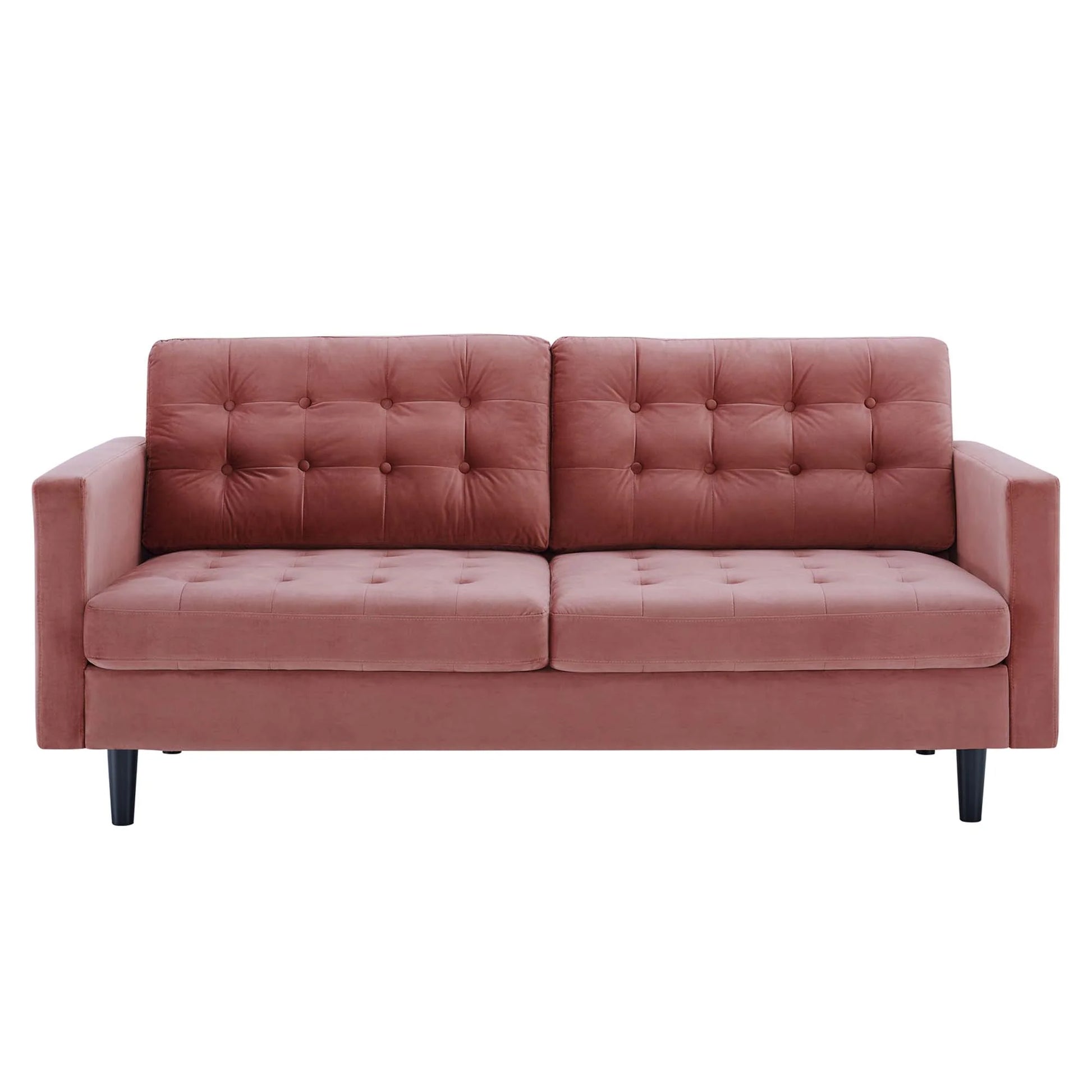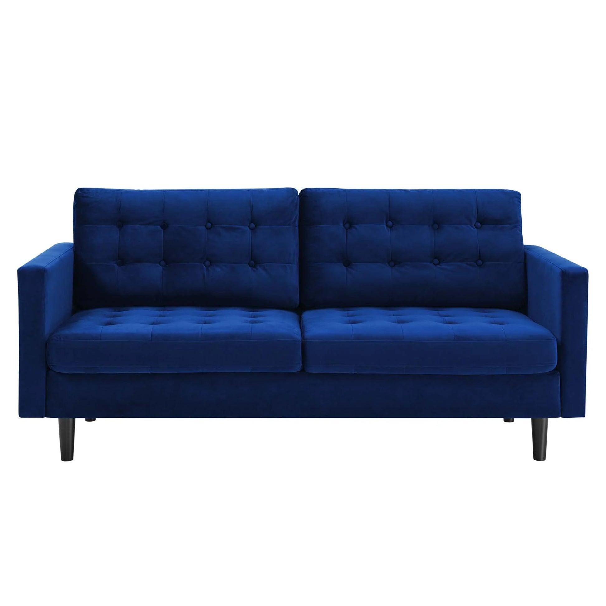Reinspire decor in a home, office, or apartment with the Exalt Tufted Performance Velvet Sofa. Featuring deep button tufting and rounded edges, this upholstered sofa abounds in glam deco style and mid-century modern design. Covered in soft, stain-resistant performance velvet, this tufted sofa is complete with dense foam padding and a sinuous spring support system for a premium seating experience. This velvet sofa is crafted with durable solid wood and rests on four black wood legs with foot pins to protect flooring. Bring retro modern charm to your living room, bedroom, lounge room, den, or home office with Exalt. Assembly required. Sofa Weight Capacity: 900 lbs.