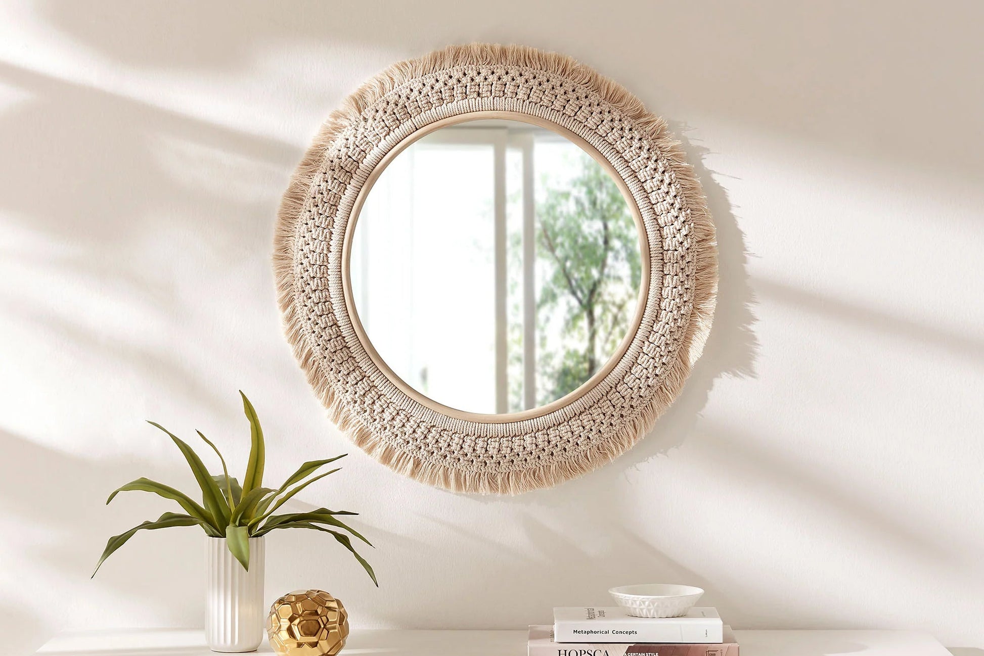 Add a relaxed, organic touch to your home with the Jade Wall Mount Mirror, a rattan wall mirror wrapped in handwoven macrame design using soft cotton for a breezy, boho bathroom mirror look. This round mirror adds vintage charm with its natural materials and soft fringe detailing, making it a standout piece in any bedroom, hallway, or vanity setup. Designed for effortless styling, the Jade Macrame Mirror arrives fully assembled and ready to hang, instantly transforming blank walls into curated corners. A true accent that blends art and utility, it’s the perfect rattan mirror for laid-back, retro-inspired interiors. Product Note: Due to the natural qualities of rattan, slight variations in color and pattern are to be expected, adding to each piece’s unique character.
