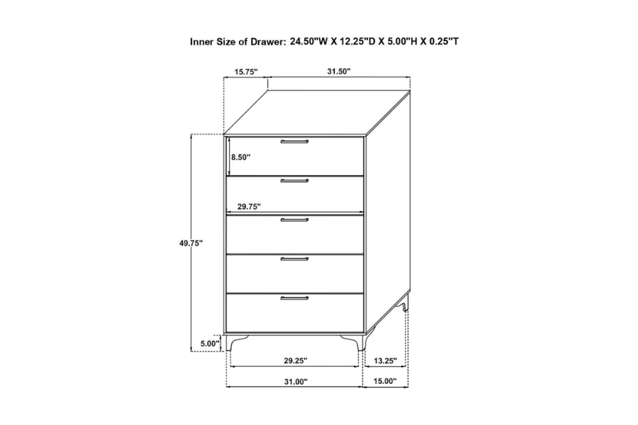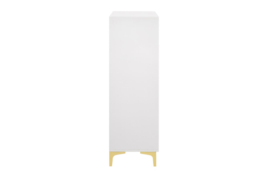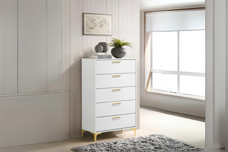 * Perfect for contemporary and modern bedrooms * Five deep drawers offer all the space you need for garments and accessories * The bright, white finished frame ensures a light and airy disposition * Gold finished pull handles create a luxe flair * Gold bracket style legs carry through the warm metallic accents |