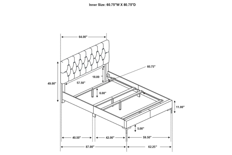 * Perfect for contemporary and modern bedrooms * Clean styling with diamond shaped stitching and gold metal plates as decoration and golden legs * The bright, white finished frame ensures a light and airy disposition * Upholstered in a bright, white leatherette throughout the platform bed frame * Gold finished hardware and bar buttons create a luxe flair |