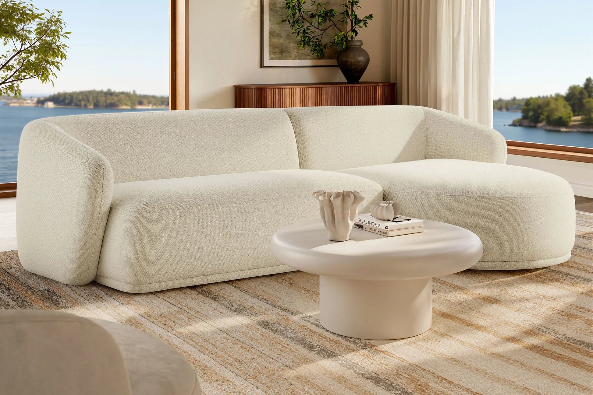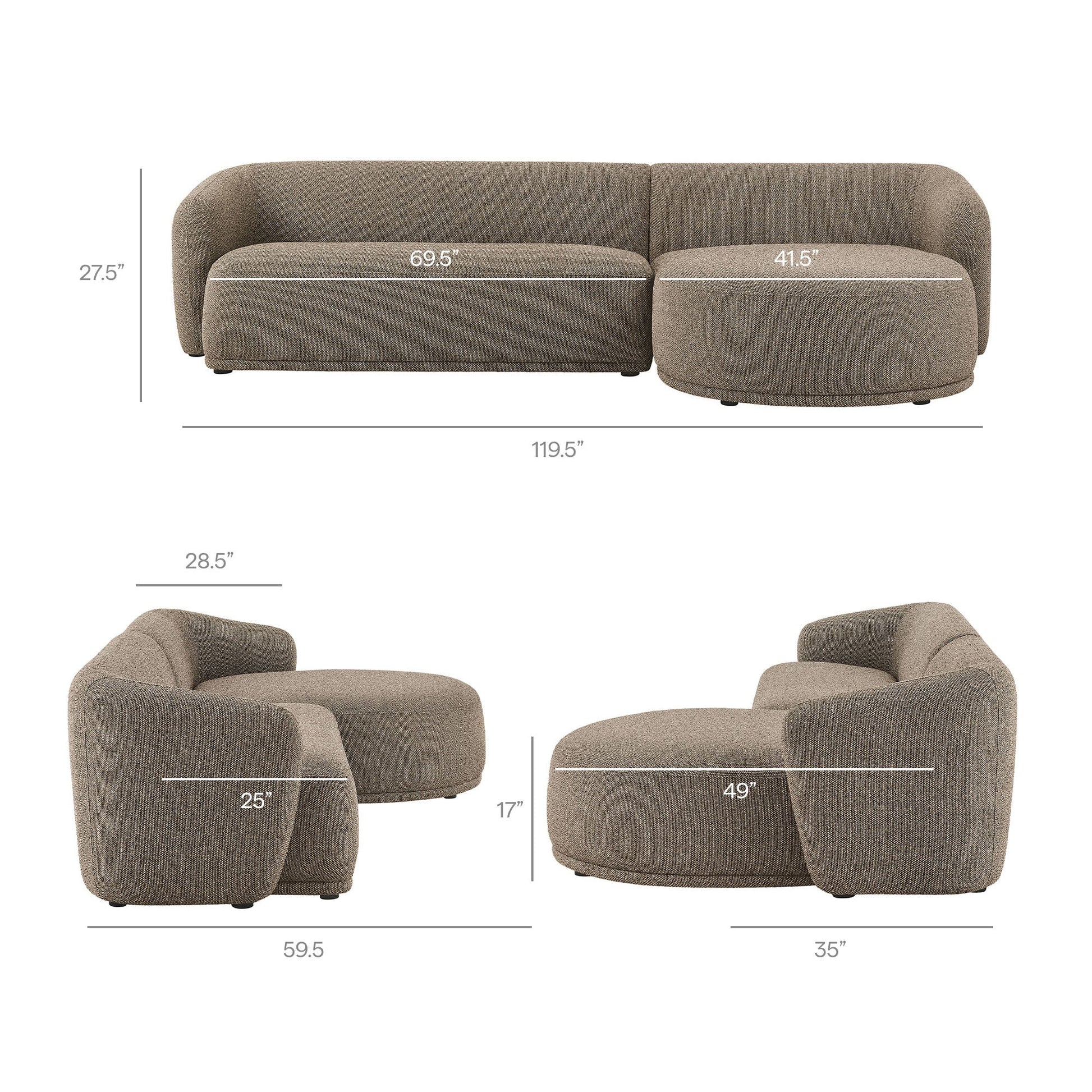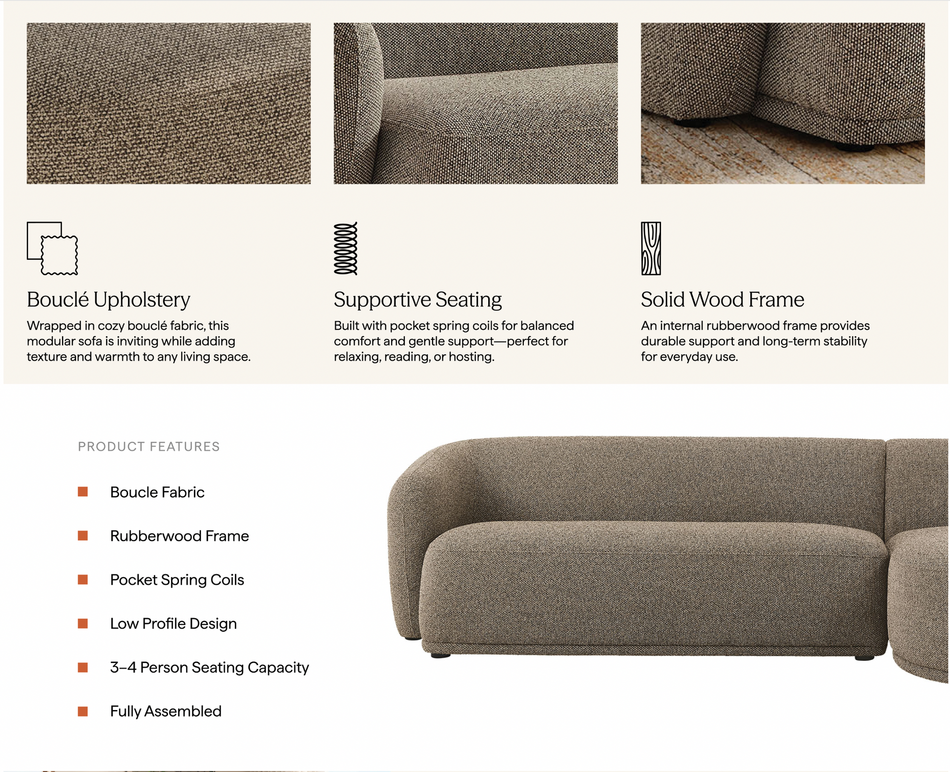 Settle into the inviting curves of the Monica Bouclé Sectional, a two-piece couch that brings a clean, cohesive look to anchor any room. Wrapped in soft bouclé fabric, this right-arm design pairs a chaise with a one-arm loveseat to form a right facing sectional with a low, rounded silhouette that fits neatly in modern spaces. Built on an internal wood frame with a supportive spring pocket coil system, it seats 3–4 comfortably and arrives fully assembled. Loveseat Weight Capacity: 600lbs; Chaise Weight Capacity: 300 lbs.