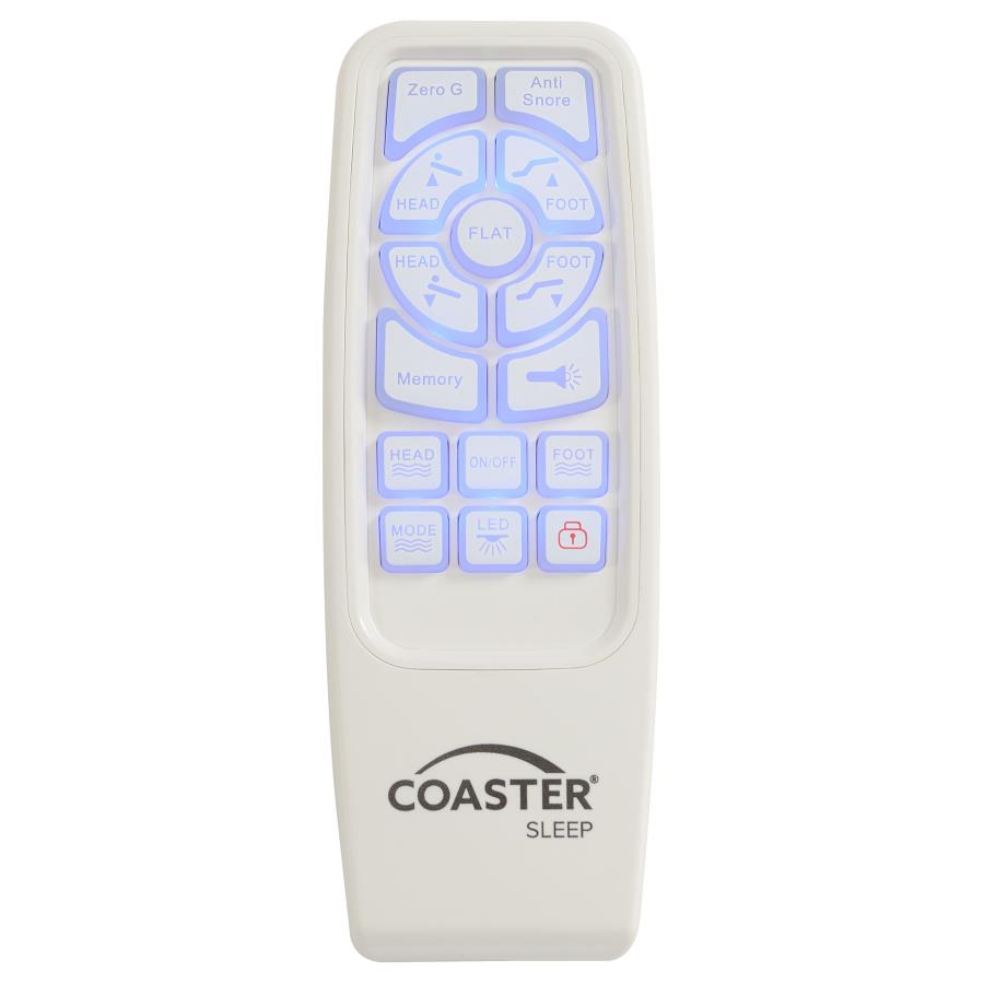 Revitalize yourself each and every night with this stunning multifunctional adjustable bed base with grey fabric trim and adjustable or removable legs. The bed base delivers the latest in modern technology with dual massage function on the head and foot of the bed, with three levels of intensity for optimal relaxation. The bed is equipped with a wireless remote that's backlit and gives full control of the height of the head and foot of the bed and includes presets for a most comfortable night's sleep. Each side of the bed is equipped with a dual USB port perfect for keeping bedside electronics charged and ready to use. You can even control the bed from your phone with Bluetooth connectivity and the Coaster app installed on your smart device. This premium adjustable bed base revolutionizes your bedroom into a relaxing multi-functional space and provides an abundance of features and customizable ergonomic positions to get great sleep and revitalize yourself. • Wireless remote features backlit soft-touch controls for independent head and foot incline, preset Zero Gravity/Antisnore/Flat/Memory positions, as well as a handy integrated flashlight Twin Xl Adjustable Bed Base Width: 37.50 Depth: 79.00 Height: 15.00 Weight: 101.43 lbs Full Adjustable Bed Base Width: 53.50 Depth: 73.50 Height: 15.00 Weight: 125.69 lbs Queen Adjustable Bed Base Width: 59.00 Depth: 79.00 Height: 15.00 Weight: 141.12 lbs Eastern King Adjustable Bed Base Width: 74.75 Depth: 79.00 Height: 15.00 Weight: 187.43 lbs California King Adjustable Bed Base Width: 78.75 Depth: 83.50 Height: 15.00 Weight: 187.43 lbs |
