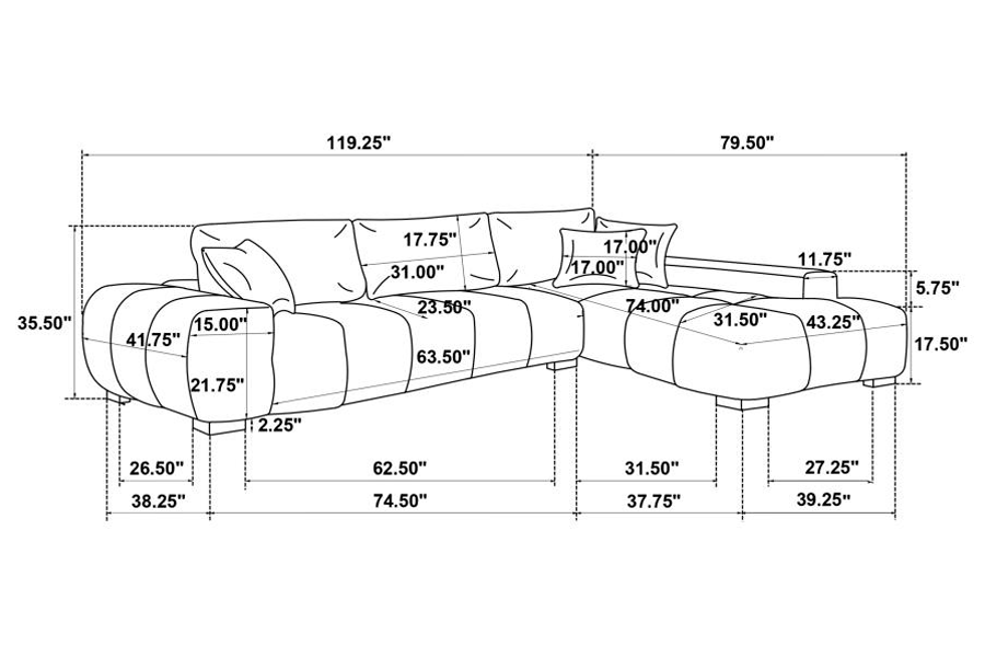 | Embrace comfort and timeless style with this mid-century inspired sectional sofa. Designed for relaxed lounging, it showcases wide, rounded arms and plush waterfall seat cushions adorned with subtle grid tufting. Soft, neutral upholstery envelops a sturdy frame, ensuring lasting quality. Reversible back cushions and supportive accent pillows let you effortlessly customize your seating experience. The result is a captivating centerpiece that elevates any living area’s ambiance. | |