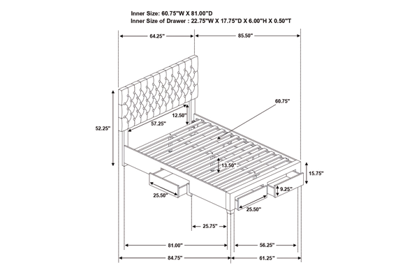 | • Storage bed upholstered in a light grey fabric • Features four (4) storage drawers • Button tufted headboard • Rubberwood and MDF frame • Slat kit included • Available in light grey and charcoal |