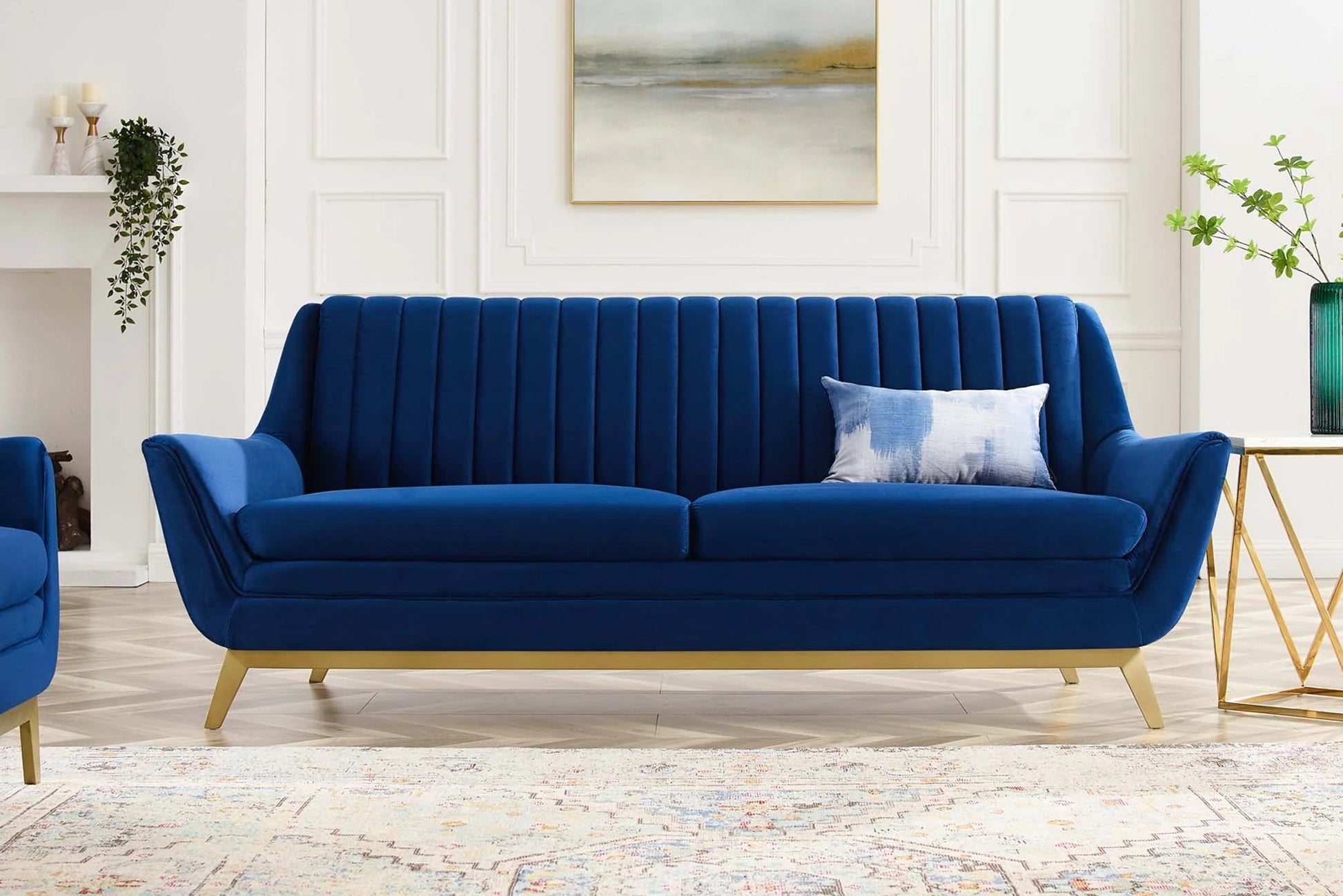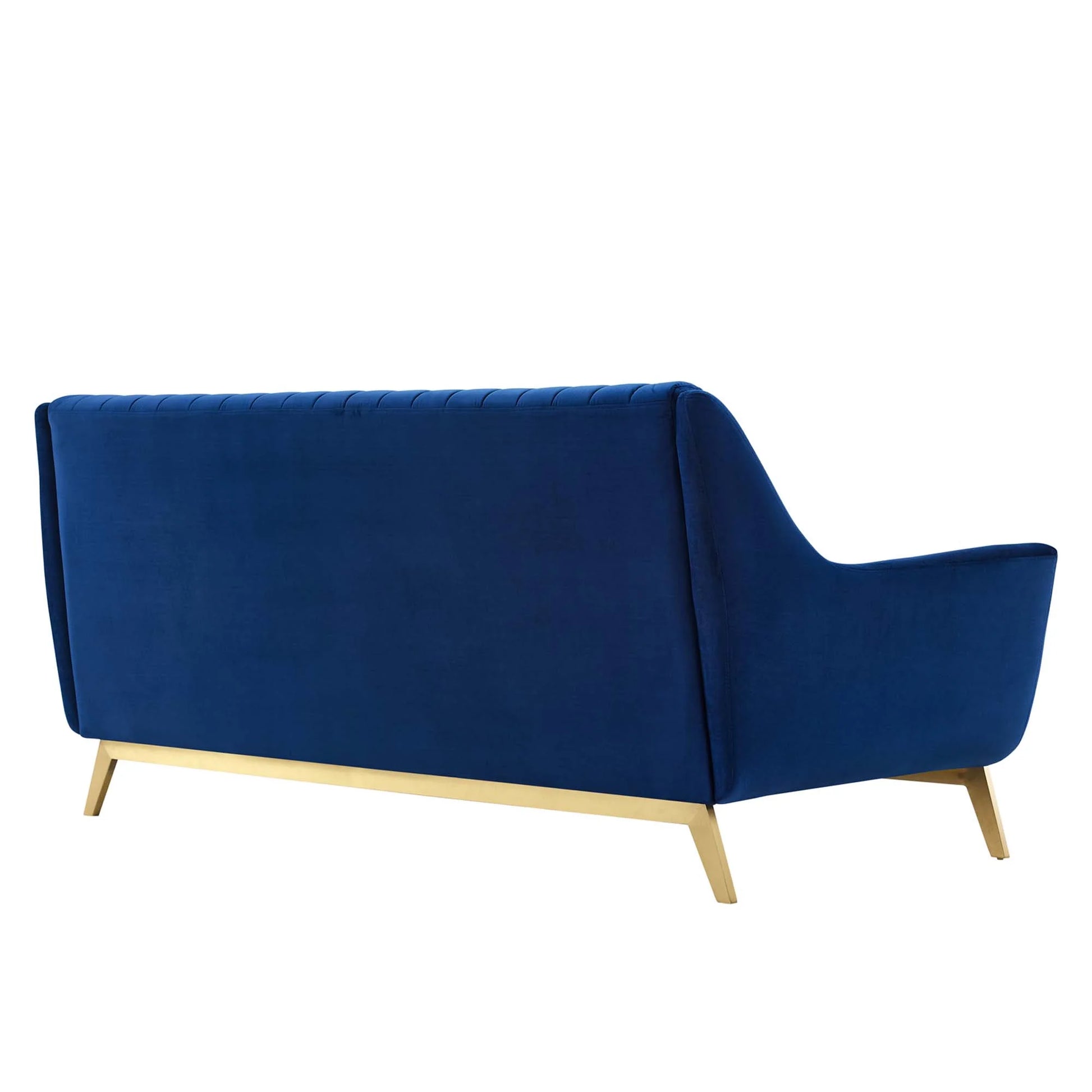 Bring rich tactiles and vintage modern charm to your living space with the Winsome Channel Tufted Performance Velvet Sofa. Putting a glam deco twist on a classic mid-century modern design, this living room sofa features vertical channel tufting on the backrest, gold metal detail, and a flared silhouette. Covered in stain-resistant performance velvet, this upholstered sofa is padded with dense foam and complete with a no-sag pocket coil spring support system. With a solid wood and plywood frame, this velvet sofa rests on gold stainless steel legs with plastic foot glides and supports up to 900 lbs.
