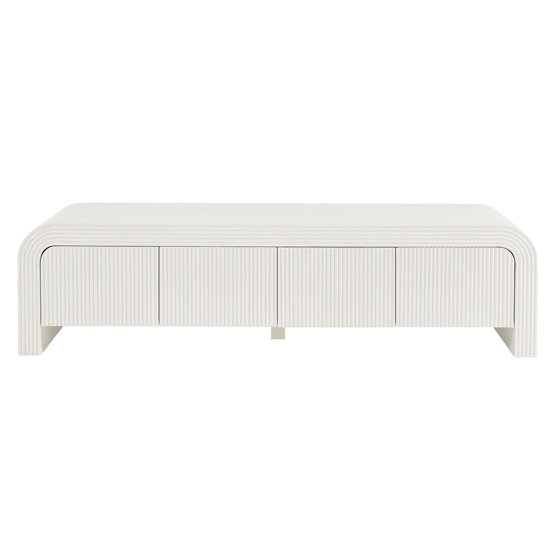 Swatch CodeSw-0569 Features4-Door Fluted TV Stand Waterfall Edge Design Push-to-Open Doors Adjustable Shelves Cable Management Holes with Covers |